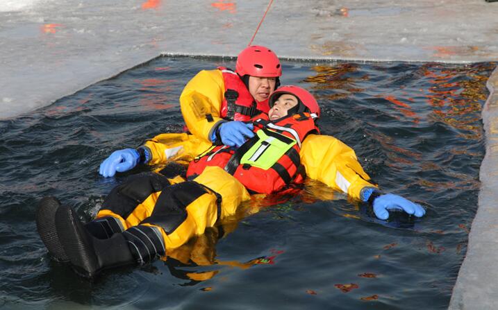 1月3日,在新疆维吾尔自治区阿克苏市南工业园区人工湖的冰面上,阿克苏地区消防救援支队交通路特勤站潜水员苏小奎身穿干式冰面救援服、PFD水域救生衣,与队友们开展冰面低姿匍匐前进、破冰作业、船只拖拽救助等6个冰面救援科目训练。苏小奎是阿克苏地区消防救援支队唯一一名获得国际二级救援潜水员资格证书的消防员。