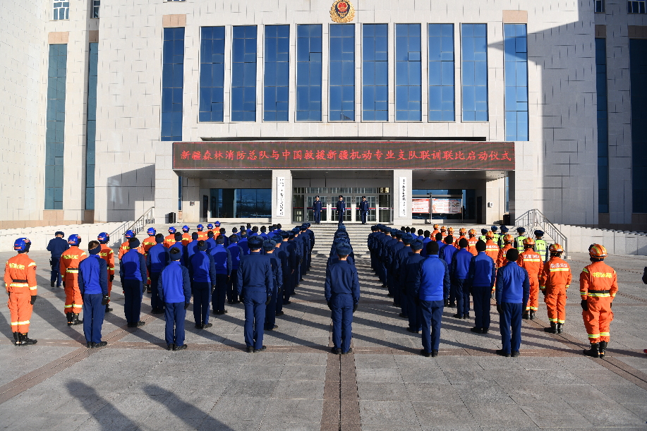 为贯彻落实全区消防救援队伍冬季执勤训练工作动员部署会精神,进一步营造浓厚的练兵氛围,树立“练兵有功,备战光荣”的鲜明导向,中国救援新疆机动支队与森林消防总队特勤大队联合开展联训联比活动。2022年1月18日上午“新疆森林消防总队、中国救援新疆机动专业支队联训联比启动仪式”在中国救援新疆机动专业支队正式启动。今年的联训联比活动,计划每季度开展一次,每次两支队伍各派遣20名消防救援人员参加。通过开展联训联比活动全面提升消防救援人员综合能力素质和实战水平,同时也为参赛人员提供一个同场竞技、切磋提高的平台,促进两支队伍在救援方面的交流、交往和交融。森林消防总队灭火救援指挥部副部长赵永波、中国救援新疆机动专业支队支队长舒海疆及双方比训人员共计110人参加了上午的起动仪式。