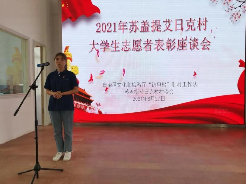 大学生代表萨丽麦说:“我在武汉上了初中和高中,2021年考入福建师范大学。从初中以来,我一直在外地求学,可是我特别期待假期,因为我的家乡变化太大了,家乡越来越美了,村民的日子越过越好了,乡亲们开心地笑起来啦!我的家乡路变宽了、平了、干净了,路灯亮了,星光大道照亮了我的家门,还有我们村的树越来越多,春天是花的海洋,夏天果实累累,秋天是一幅美丽的画卷,这里的新时代文明实践站是我假期生活学习的好去处,丰富多彩的文化活动让我的假期过得非常充实。”