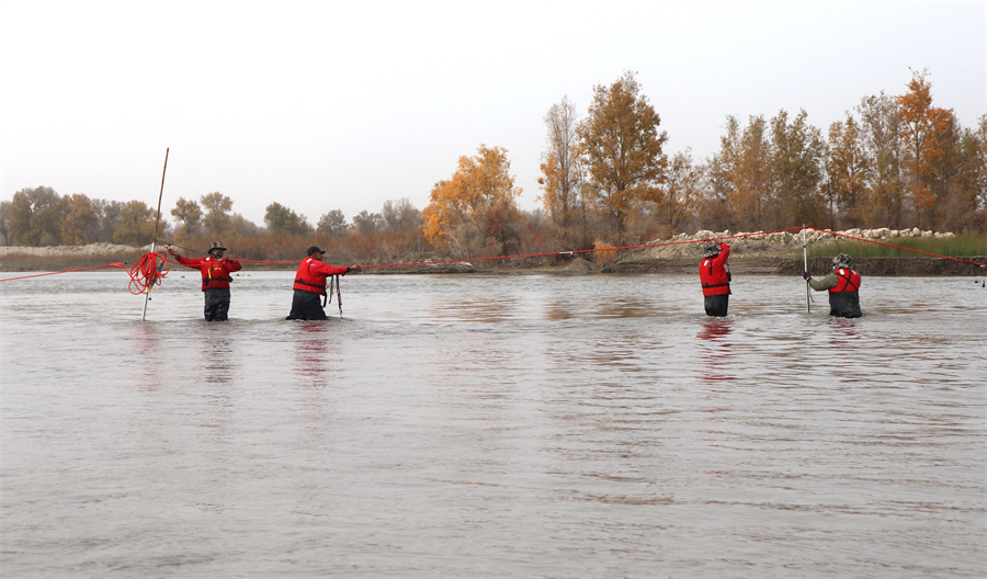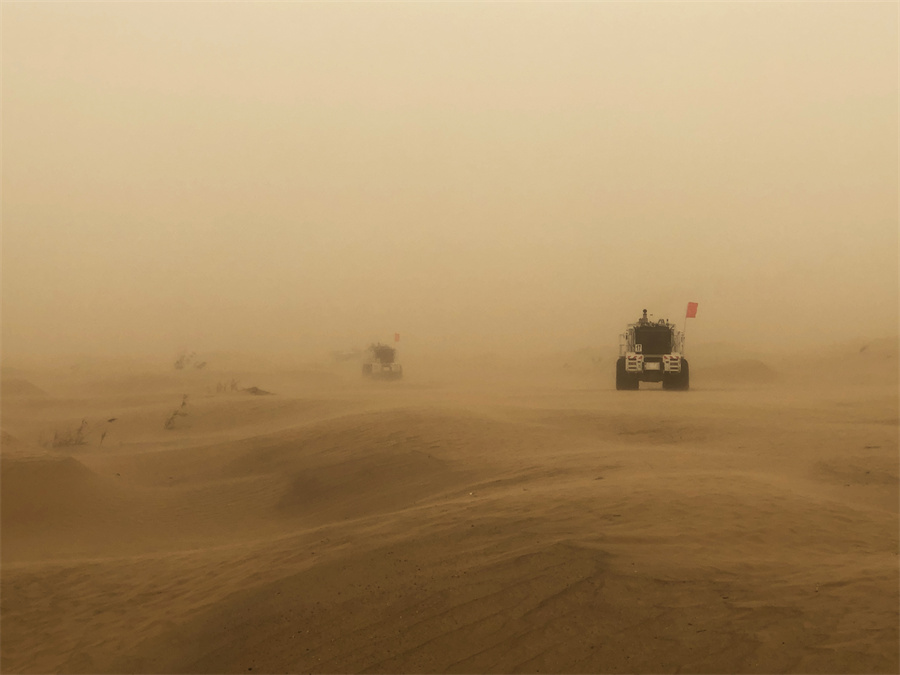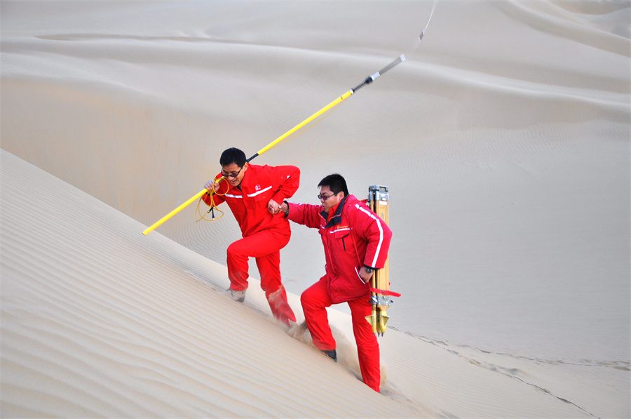 井堪技术员翻越沙漠进行井位勘定。赵继沛 摄