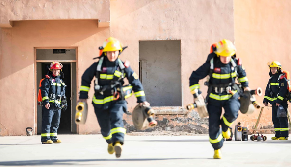 顾光成(后左一)带着消防救援队员们训练。石榴云/新疆日报记者 聂宁摄