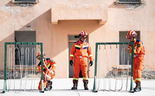 顾光成(中)带着消防救援队员们训练。石榴云/新疆日报记者 聂宁摄