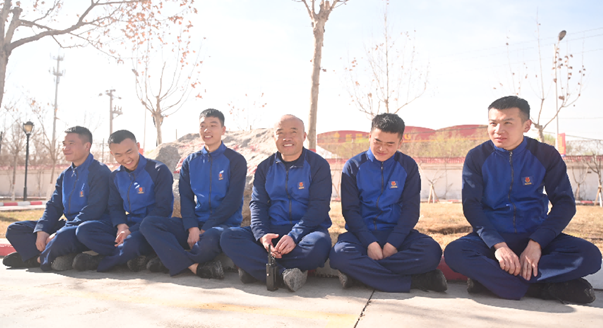 午饭后,顾光成(左四)和消防救援队员们聊天。石榴云/新疆日报记者 聂宁摄