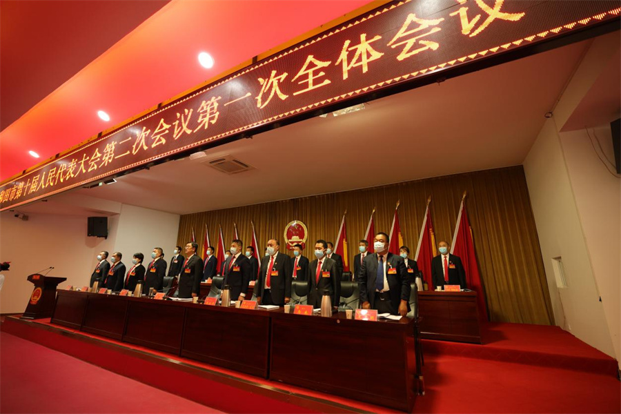 和田市第十届人民代表大会第二次会议开幕,全场起立,奏唱国歌。