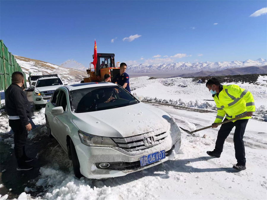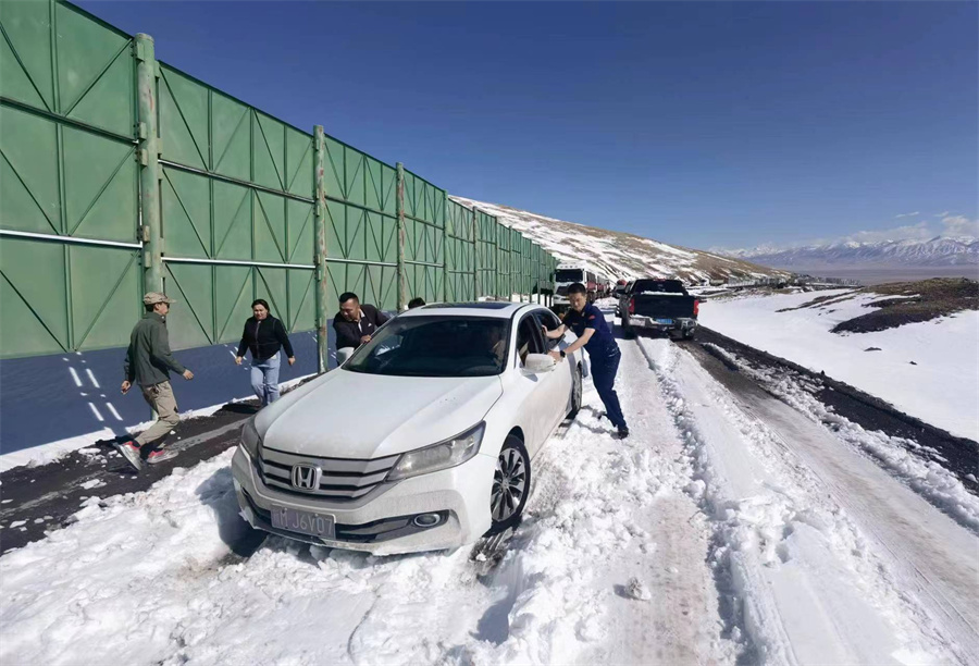 “一二三,推!一二三,推!”4月29日,在国道218线K411-K427路段和田地区消防救援支队一级指挥员李健正带领“志愿清雪队”不停挥舞铁锹清铲着积雪,一点一点挪动着积雪中的汽车。