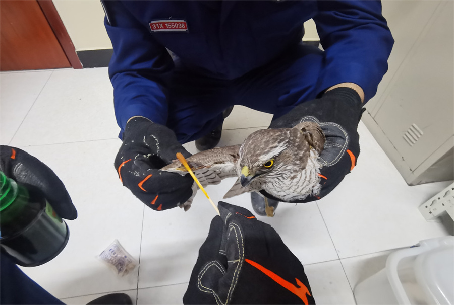 经消防救援人员现场确认,这只鹰隼两个翅膀和腿部都有明显伤势,随即用碘伏和云南白药对其进行了消毒及消炎处理,且准备了生肉喂食,帮助它尽快恢复体力。在鹰隼吃饱确认可以正常飞行后,救援人员在营区寻找到一片合适地域将其放飞。