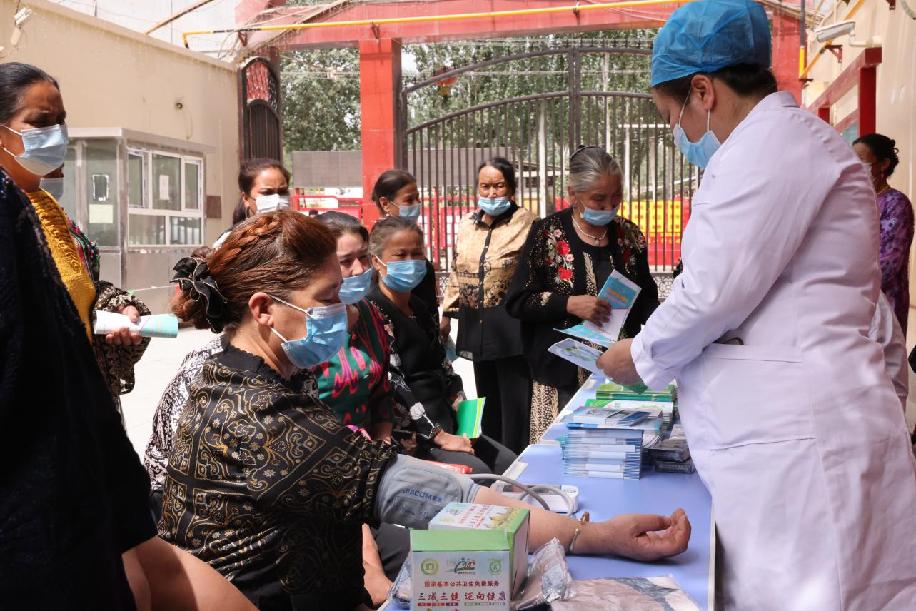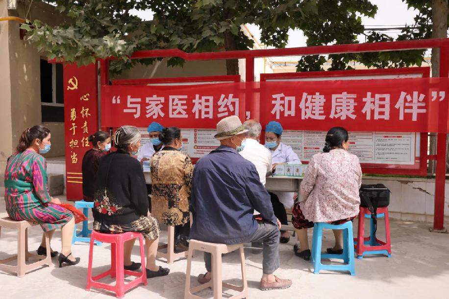 和田市玉龙喀什镇卫生院的医护人员在阿勒提来村开展免费义诊活动。(阿卜杜克热木 摄)