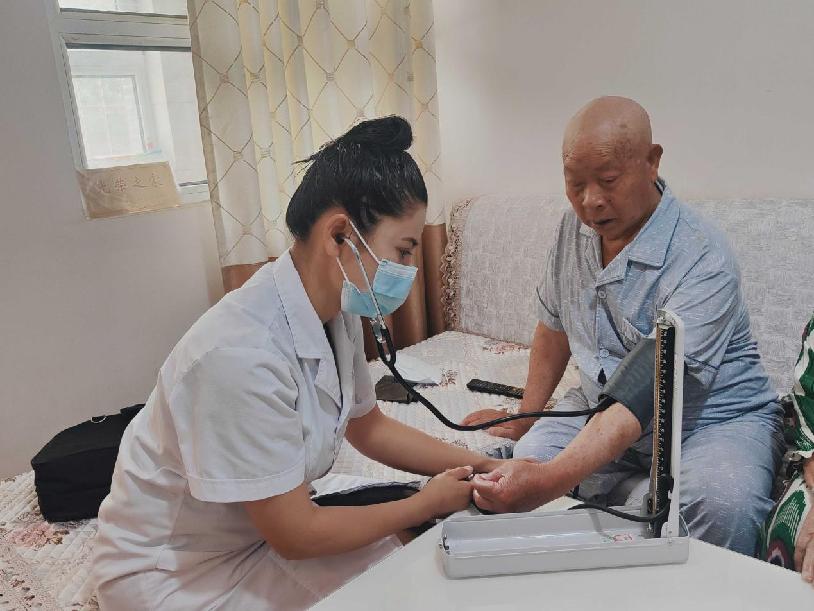 医护人员为老人测血压、血糖。(阿卜杜克热木 摄)