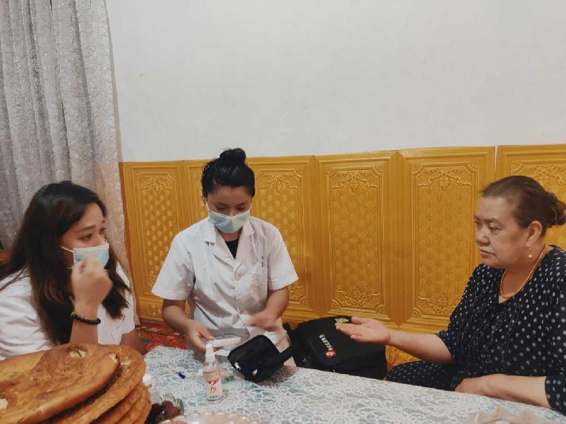 努尔巴格街道卫生院的医护人员在辖区老人家里测血糖。(阿卜杜克热木 摄)