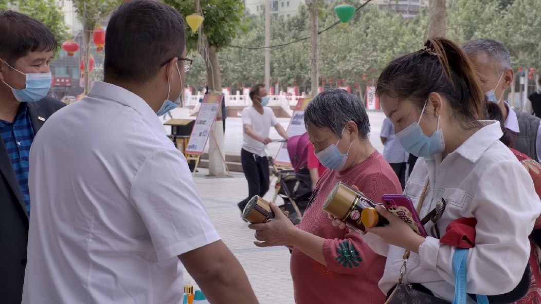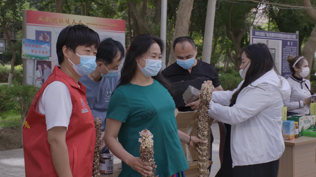 和田市科学技术局党组副书记、局长张道玲说:“我们和和田地区、和田县,还有兵团十四师共同举办‘科技活动周’,对我们科技的这个法律法规进行宣传,通过发放宣传单,让我们更多的市民去了解科技政策。今天,请来了全市19家的龙头企业,把我们的产品展现给大家,有这个农副产品、化妆品、食品、药品。”