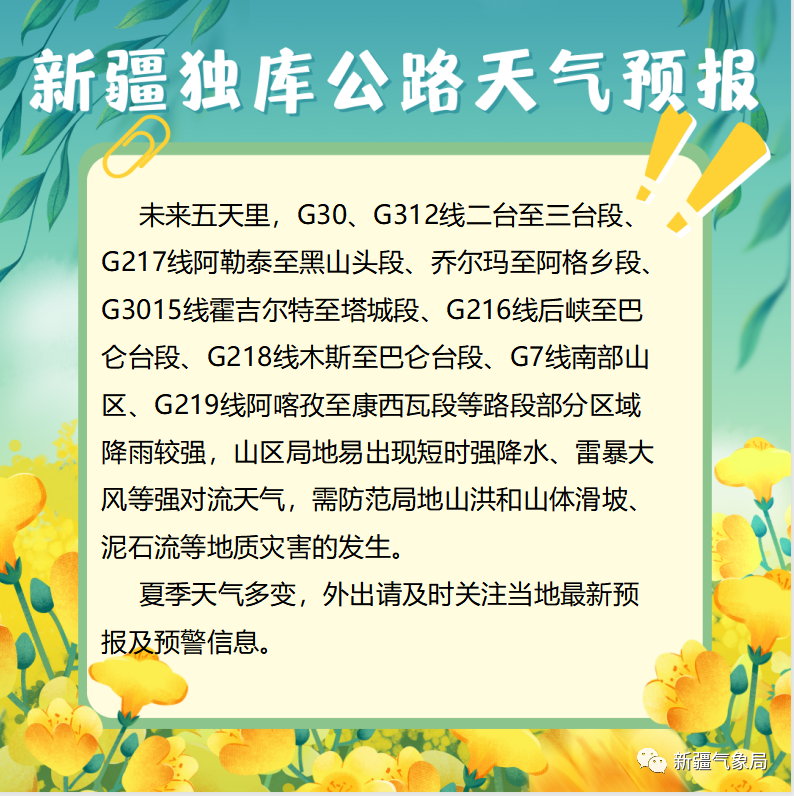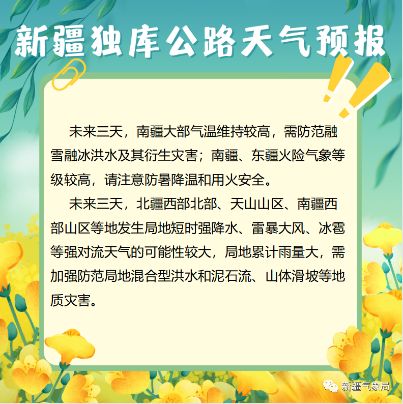 4.气象部门提示,由于天气变化存在不确定性,游客请关注最新天气预报预警信息,合理安排好旅游和出行计划。目前正处在旅游季节高峰时段,进山游客要特别注意山区天气变化,根据天气情况合理安排出行路线,游客可关注新疆气象局微信公众号,及时获取独库公路天气信息。
