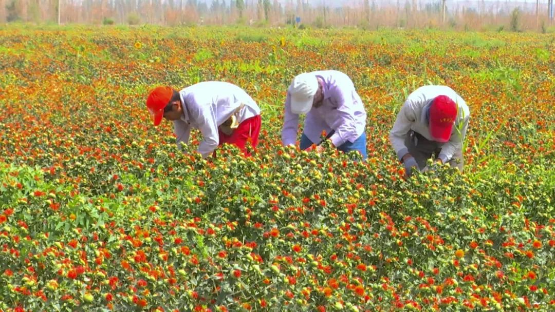 红花又名草红花,耐旱抗盐碱,焉耆县七个星镇的地理环境和水土光热条件非常适宜红花的生长。从6月底开始采摘,7月采摘结束,负责人告诉记者,红花种植成本低。红花籽还可以制作成食用油,红花籽一公斤可以卖到8元,每亩地收益800元,红花秸秆可以制作成饲料每亩地能卖80元,目前,红花市场价格在每公斤120-130元。按照目前的市场价格今年红花的种植效益最高可以达到每亩3000元左右。