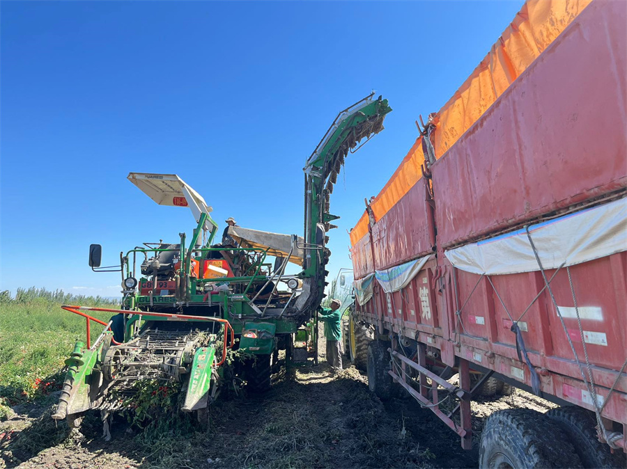 村民刘越说:“很感谢驻村工作队、村干部和党员同志们的帮助,我今年种植了50亩番茄,今明两天就可以收完。以前番茄采收都需要人工采摘,很辛苦。现在种植、采摘都实现了机械化,又快又省人力,人没有那么辛苦了。”随着交易价格良好,更加激发了村民们种植番茄的热情。村民姚同文今年种植的番茄平均亩产在10吨左右,亩产量纯收入预计3000多元,番茄收入会给他带来10万余元的经济效益。