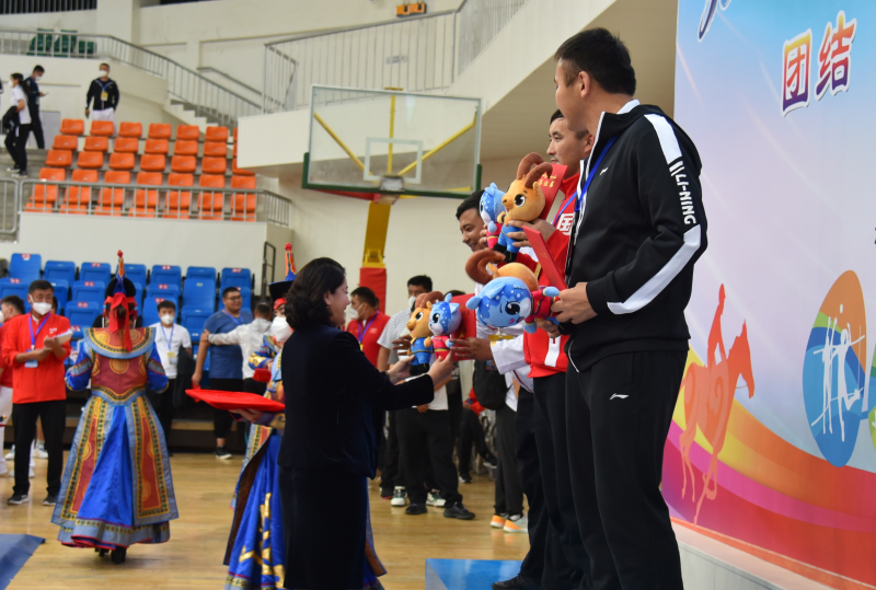 为获奖运动员颁发本届运动会吉祥物。买合木提 摄