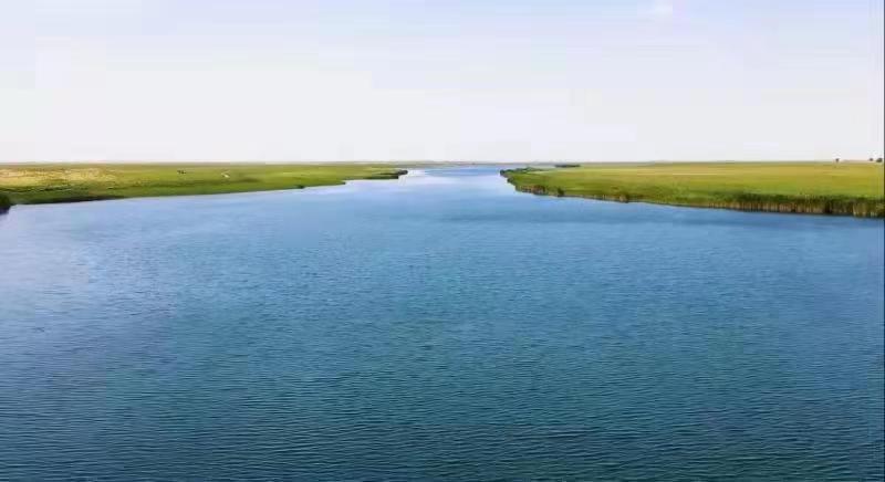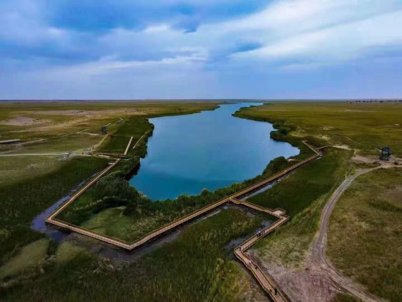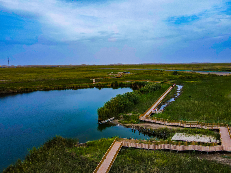 湖水面上野鸭、水鸟、大雁等飞禽游弋,湖岸边牛羊成群,环境优美,风光绮丽。周围被绿洲环抱,远处是高大的沙丘,给人以美好的遐想。