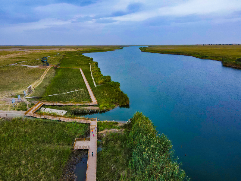 清澈的湖水、岸边的芦苇、湖边的木栈道,构成了一道美丽的风景线。走在木栈道上,穿梭于芦苇丛中,可以观赏鱼湖美景。