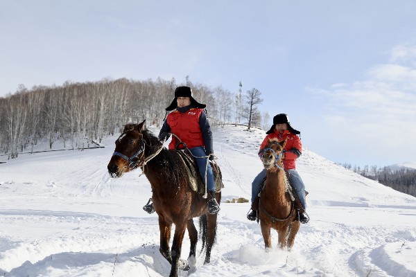 11月19日,国网阿勒泰供电公司禾木供电所员工张国华、齐凡骑马深入牧区排查牧民用电问题,并巡视景区供电线路,确保降雪天气线路及设备稳定运行。