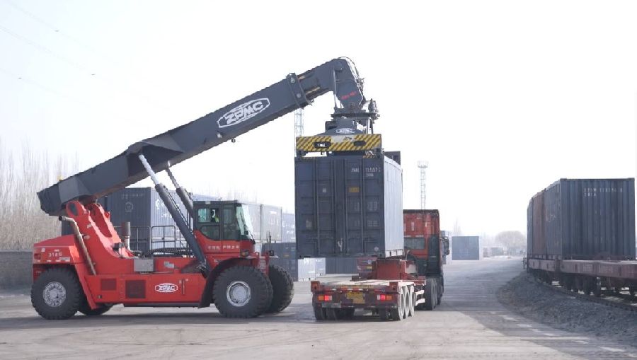 12月13日上午,在和若铁路和田站,和田货场工作人员正将抵达和田的运煤列车上的煤炭集装箱吊运到货车上转运到周边县、乡(镇)。