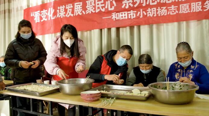 “小胡杨”志愿服务总队志愿者和幸福大院的老人一起包饺子。(穆合塔尔 摄)