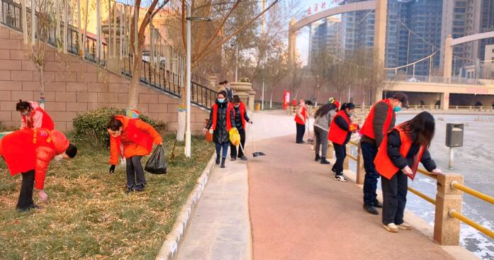 在玉泉湖公园和团结广场,志愿者们细心地清理路面和林带内的垃圾、擦拭湖边的围栏,引领市民养成良好的个人卫生习惯,践行文明健康的生活方式,共创全国文明城市。