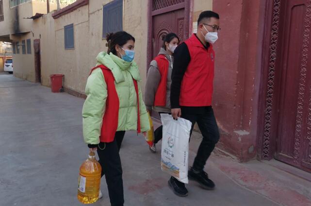 和田市夏玛勒巴格片区志愿者为辖区孤寡老人送去慰问品。(闫兆霞 摄)