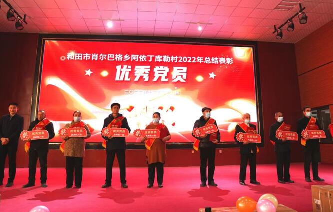 元旦晚会上,阿依丁库勒村为获得“优秀党员”等荣誉的干部、村民颁奖。(才让东主 摄)
