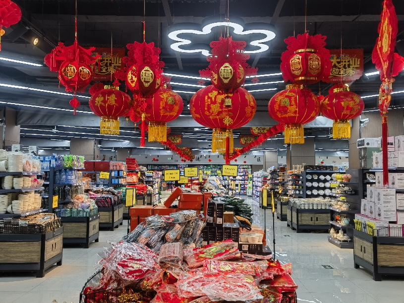 如今,红色已成为各超市的主色调,在策勒县世纪华联超市里,各种装饰品把春节的气氛烘托得喜庆十足。超市也已启动“年货”模式,里里外外张灯结彩,糖果、饼干、瓜子等各种年货已然上架,红灯笼挂满了整个超市上方、春联等商品琳琅满目,增添不少年味儿。超市陈列的节庆商品和礼盒,年货展板和红灯笼装点着浓浓的新春佳节氛围。走进超市,通道上“年货大街”的字眼分外显眼,灯笼、中国结再加上精心布置的年货展台看上去格外喜庆,丰富多样的年货、销售货架上各种各样的零食、果蔬、生活用品等货品摆得满满当当,春节促销优惠活动也已经悄然开启。各超市店内都布置得红红火火,不少居民穿梭其中,挑选着心仪的年货,一年中最红火的消费热潮已然临近。