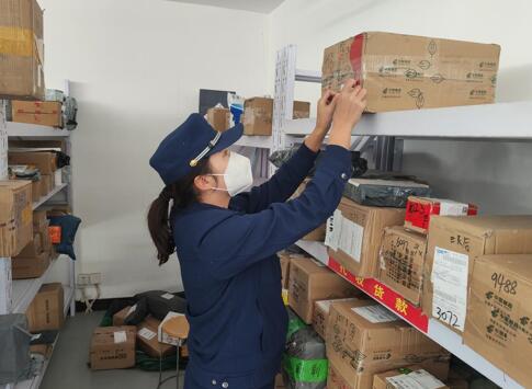 消防宣传员和快递营业点工作人员一同在快递包裹张贴消防安全提示。热沙来提•艾山摄