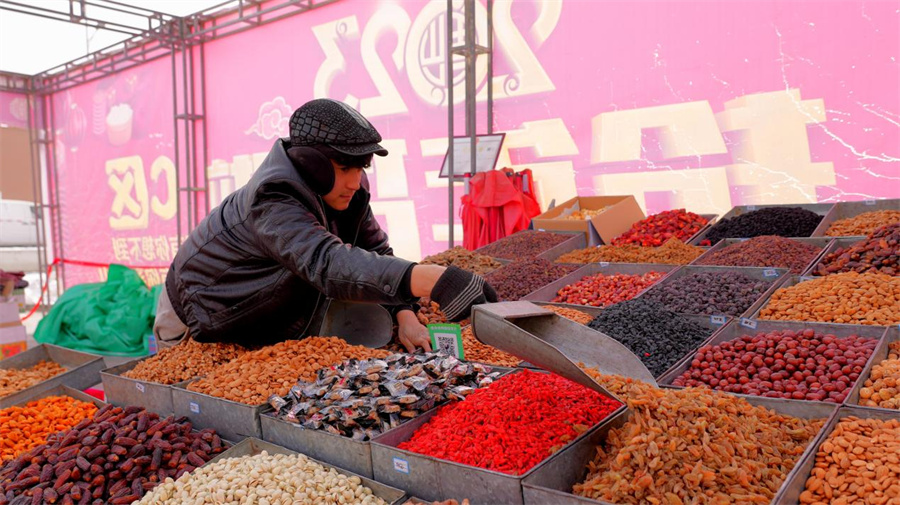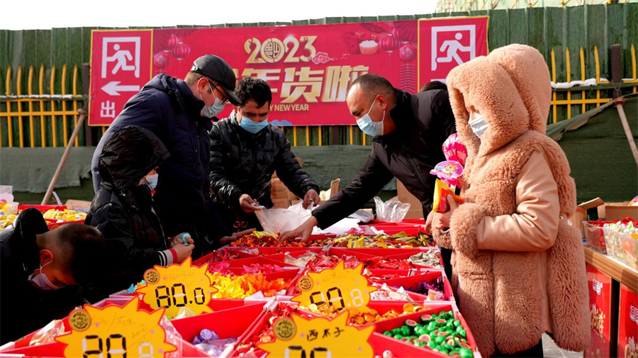 1月17日,记者走进玉都国际大巴扎年货大街看到,丝绒烫金的春联、镶边彩框的福字、款式多样的兔年卡通玩偶,大大小小的灯笼尽收眼底,现场还展销了来自和田地区的大枣、核桃、葡萄干、巴旦木、干果脆等百余种特色产品,闻讯而来的市民既能选购心仪年货,又能品尝美味美食。沿街的摊位依次排开,叫卖声、音乐声此起彼伏,气氛热烈、年味浓郁。
