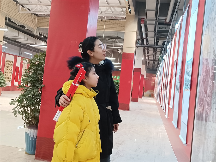 和田市古江巴格街道墩巴格社区居民努尔曼古丽·麦麦提阿西木带着孩子欣赏书画作品。(李笑 摄)