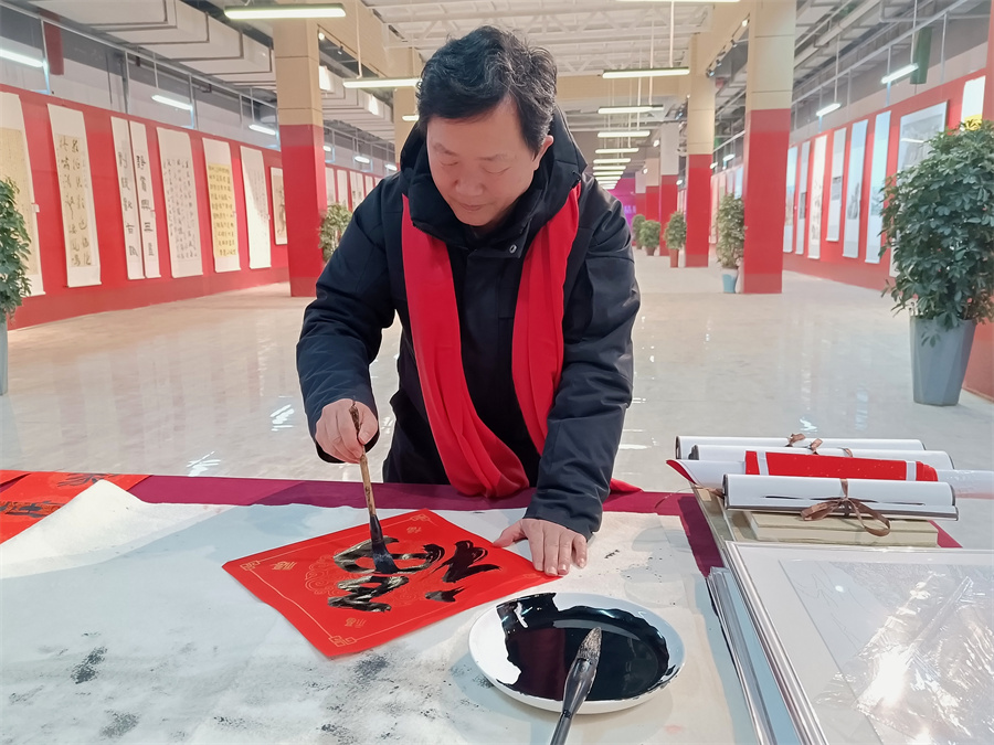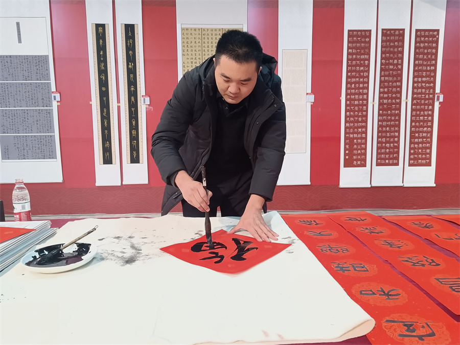 和田地区书法爱好者白建飞正在创作作品。(李笑 摄)