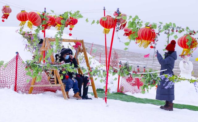 1月24日,游客在洛浦县丝路滑雪场合影留念。买买提艾力•艾尼瓦尔摄