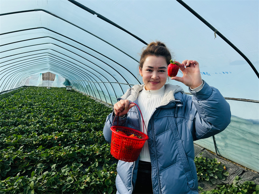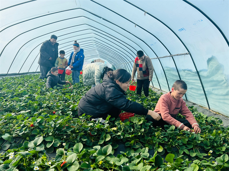 1月29日,在古江巴格乡如克村的草莓采摘园里,一排排草莓长势喜人,绿油油的叶子间点缀着一颗颗红彤彤的果实,红似玛瑙、色泽鲜艳,不少市民带着孩子前来采摘草莓。布吾阿热西木开心地说:“今天我和朋友来这里采摘草莓,这里的草莓又甜、又大,种类也很多,我和朋友都很开心。”