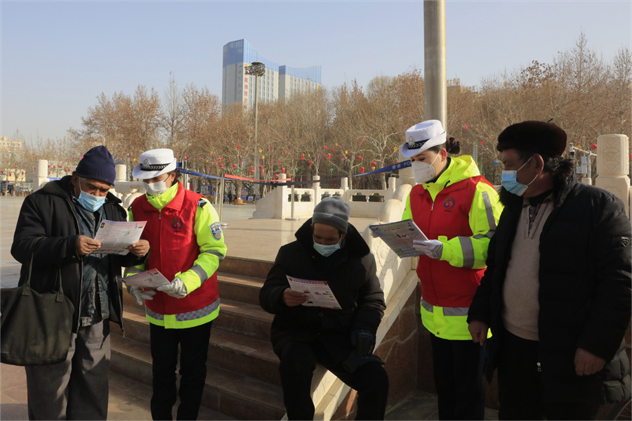 1月29日,和田市公安局交通管理大队组织10余名交警志愿者在团结广场及周边道路开展共建平安志愿服务活动,为过往行人及机动车驾驶人发放道路交通安全法规、安全文明出行等宣传单,对电动车、摩托车驾驶人未戴安全头盔的行为进行纠正和劝导,进一步做好节后道路交通管理,净化道路交通环境,保障各族人民群众安全出行。