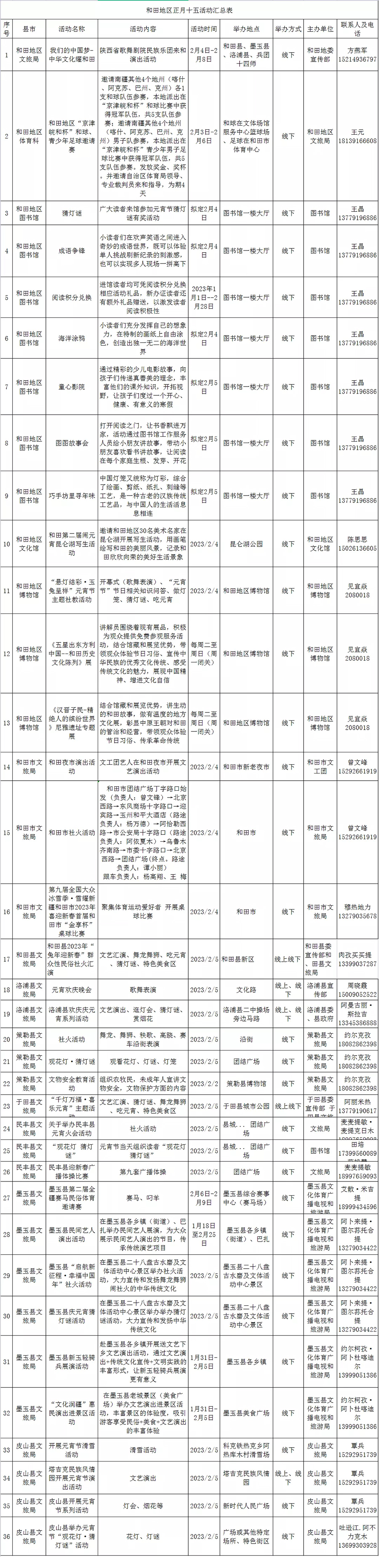 和田县2023年“兔年迎新春”群众性民俗社火汇演,包括文艺汇演、舞龙舞狮、吃元宵、猜灯谜、特色美食区。