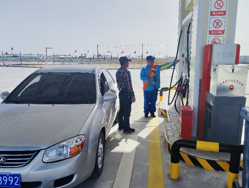 中石油新疆销售巴州南屯服务区北加油站员工为顾客加油 赵云摄