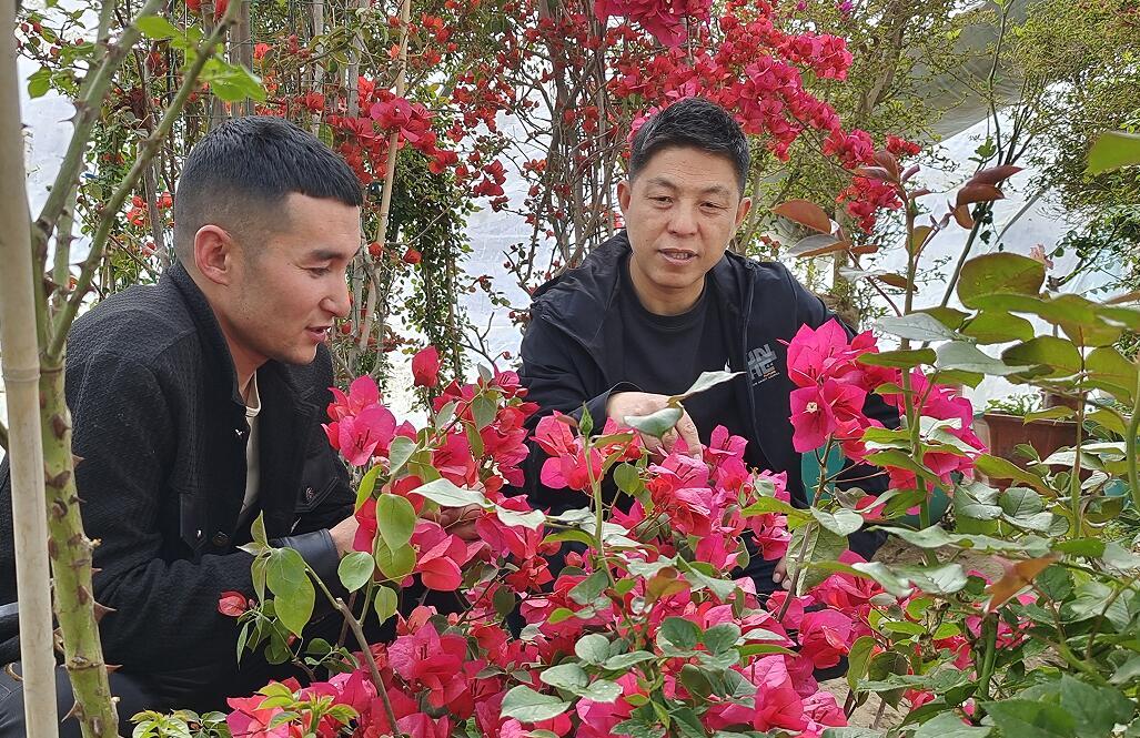 浪漫花海,花香阵阵。三角梅、君子兰、白掌、文竹、多肉等多达45种不同品种的花卉安家到了策勒县策勒镇科克买提村花卉种植基地,将生态“颜值”转化为经济产值,为乡村振兴“添香增色”。