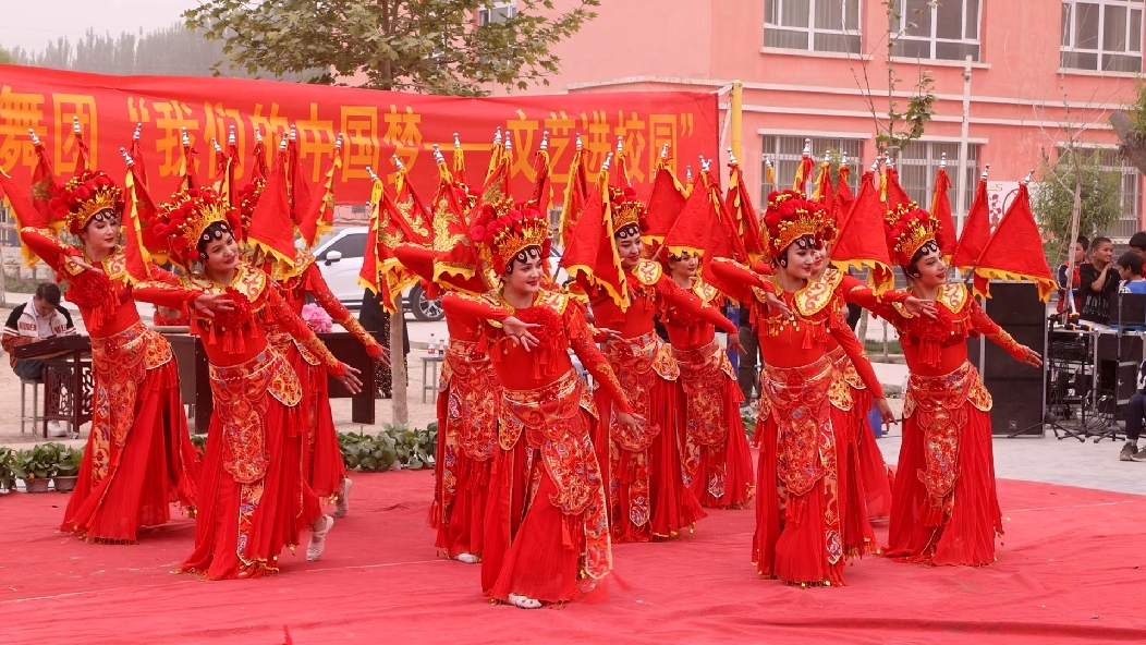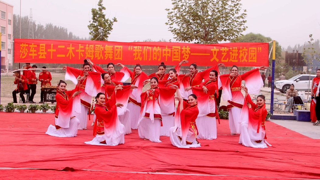 在排孜阿瓦提小学操场,由莎车县十二木卡姆歌舞团带来的形式多样的节目让在场的所有师生赞口不绝,古典舞剧《锦绣》更是将现场氛围推上高潮,演员们高超深厚的舞台功底、婀娜蹁跹的舞蹈动作深深吸引着孩子们,孩子们的眼神里充满着对中国传统文化的自豪感。戏曲串烧《中华》、乐器合奏《炫彩华章》等精彩的节目让现场响起连绵不断的掌声,将氛围推上新高度。