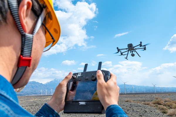 5月23日,国网乌鲁木齐供电公司输电运检人员在达坂城片区220千伏达清泉二线开展无人机特巡,保障当地风电企业清洁能源可靠发电上网。(王晋魁 摄)