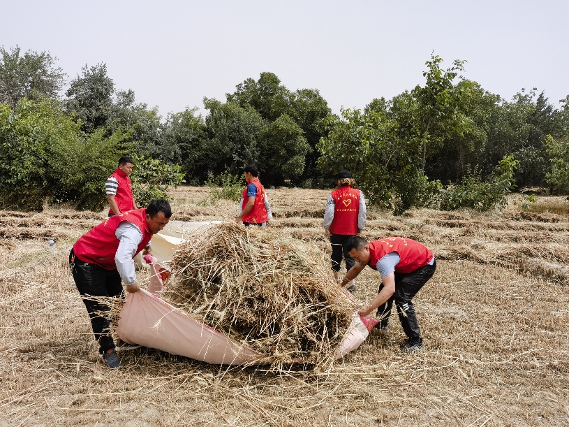 为确保小麦颗粒归仓,策勒县策勒镇敦艾日克村两委和驻村工作队,组织党员干部志愿者深入田间地头走访摸排,及时了解群众所需。特别是针对外出务工人员和年老体弱、行动不便、缺少劳动力等特殊群体,积极为他们提供“三夏”服务保障,解除困难群众小麦夏收缺人手之忧。在小麦田间地头,机器轰鸣,策勒镇敦艾日克村志愿者们身穿红马甲,同群众一道齐心协力把麦田里割好的小麦,集中到一起,准备用机器脱粒。麦田里志愿红的身影显得格外耀眼,田野里呈现出一派热火朝天繁忙劳作抢夺丰收的景象。
