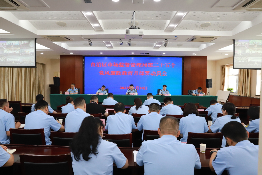 为进一步推进全面从严治党、党风廉政和反腐败斗争向纵深发展,7月10日,自治区市场监管局召开第二十五个党风廉政教育月部署动员会,党组书记朱新出席会议并对区局党风廉政教育月活动进行部署动员,党组成员、副局长周亮宣读活动方案。