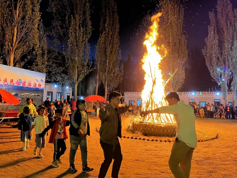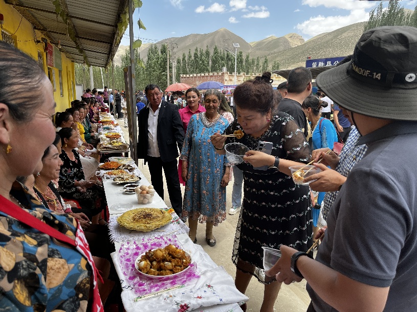 6月下旬,工作队在县委、县政府的大力支持下,在村级大舞台举办“爱在昆仑”主题特色民俗旅游活动,活动设置了跑跑卡丁车、赛马、文艺演出、美食大赛、骆驼骑行、荡秋千、奇石采挖、自助烧烤、篝火晚会、营露集散等丰富多彩的趣味活动。吸引了络绎不绝的游客,不仅带动了旅游业的发展,还将村里的土鸡蛋、土鸡、鸽子蛋、玉米等农副产品销售出去,现在的民宿日均游客可达到1500人,带动40余户村民增收。
