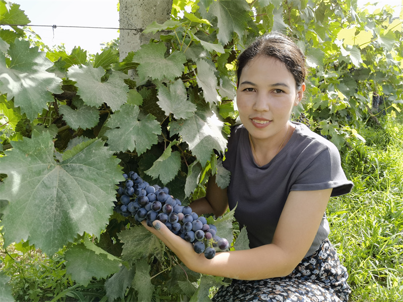 策勒县固拉哈玛镇亚克吾斯塘村党支部书记麦吐送·阿布都卡德说:“我们亚克吾斯塘村葡萄种植826亩,今年已经种第四年了,我们村每亩产量300公斤左右。一公斤四块二,一亩地收入1300块钱,我们以后继续加大葡萄田间管理,增加葡萄产量,增加农民收入。”