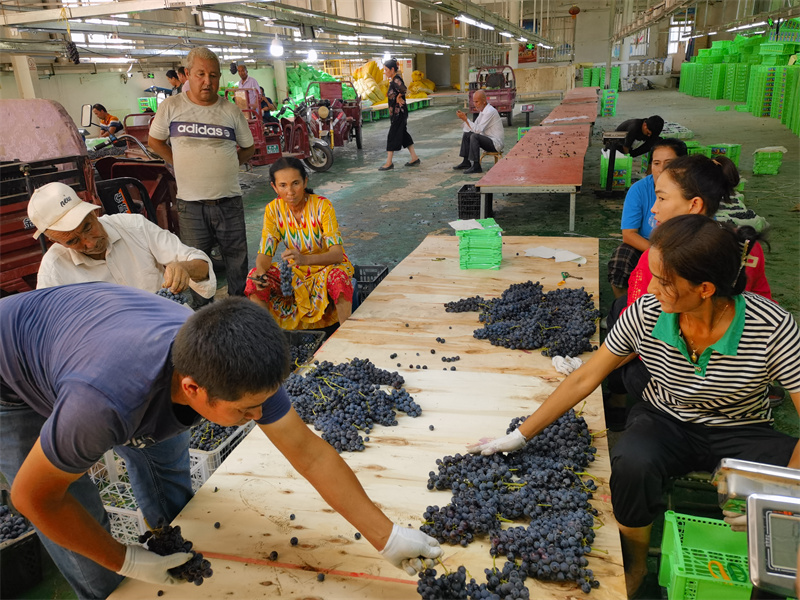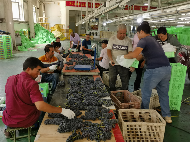 夏黑葡萄是由巨峰葡萄和无核白葡萄杂交培育而成,继承了巨峰葡萄的多汁和白葡萄的无籽两大优点,表皮呈紫黑色或蓝黑色,有着“东方黑珍珠”的美誉。同时夏黑葡萄是一种优良早熟,具有抗病、耐贮藏、口感好等特点,其果穗呈圆筒形或圆锥形,穗行整齐,果肉脆、味甜,品质极佳。在葡萄地里村民们娴熟的“挥舞”着手中的剪刀,将一串串新鲜成熟的葡萄剪下装入筐中。另一边,十几名村民正忙着将刚刚采摘回来的葡萄在厂房里进行分拣、打包、称重、装车,一派热闹景象。