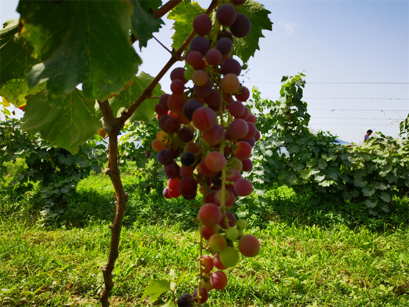 记者走进葡萄种植基地,阵阵果香扑鼻而来,葡萄架下,一串串黝黑亮紫的葡萄挂满藤蔓,个头饱满,圆润犹如珍珠,在阳光的照耀下,晶莹剔透,格外诱人。放眼望去,百米葡萄长廊郁郁葱葱,枝叶在微风中摇曳,深紫色的葡萄挂满枝头,彰显着无限生机,村民们小心翼翼地剪下一串串成熟的葡萄,满脸喜悦地享受着丰收的盛景。
