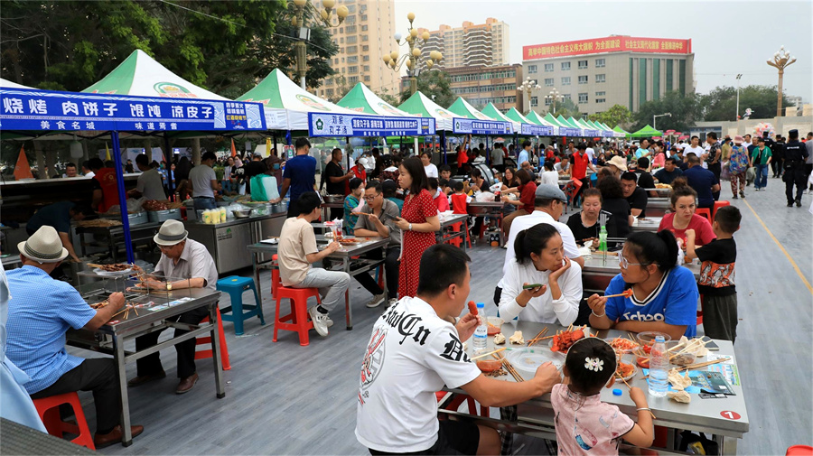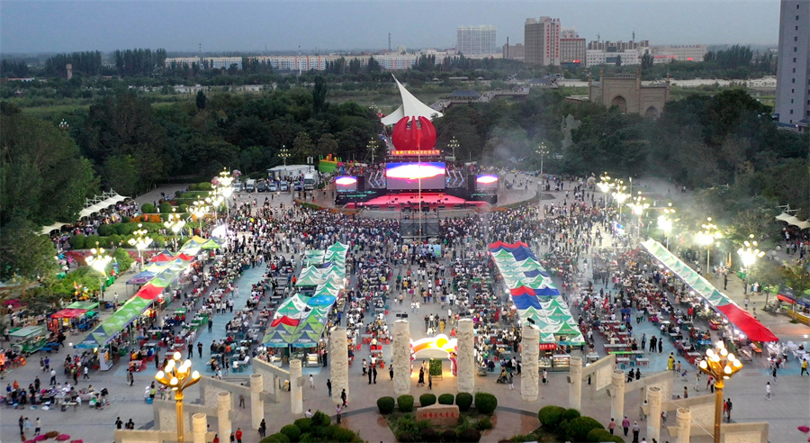8月21日晚的新疆焉耆回族自治县人民广场非常热闹,人们在这里品红酒、吃烧烤、尝美食、欣赏歌舞表演,甚是惬意。