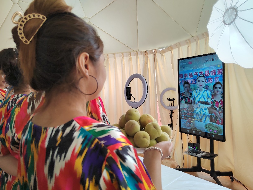 策勒县农产品电商销售中心及农产品互联网交易平台主播祖丽皮耶·吾舒尔说:“策勒县农产品电商销售中心及农产品互联网交易平台今天在板兰根旅游景点正式运行。我们的目的是,农产品销售从卖的掉、迈向卖的好,卖的久。另一方面,我们聚焦网红的力量,宣传策勒,为促进乡村振兴,高质量发展作出贡献。”