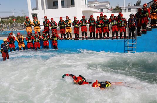 与此同时,支队争取中央预算内资金4000余万元建成了占地65亩的温宿县水域救援特勤站。其中,站内的激流河道模拟训练设施由激流模拟道、室外泳池、泵房组成,配套建设水循环处理机房。“目前场地一期、二期建设已经完成,训练已正常开展,三期还要建设学员保障中心。”支队作战训练科科长湾江龙介绍,激流模拟道能开展攻击式游泳横渡,沸腾线恶流脱困浅滩涉水横渡,动力艇快速救援,活饵救援等科目训练,河道水况实现了流量和流速安全管控,能够满足零基础入门到高阶训练的要求。