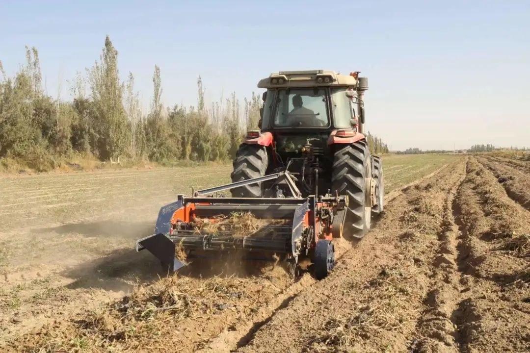 10月8日,在且末县阿克提坎墩乡色格孜勒克希庞村村民陈勇家的板蓝根地里,药材采挖机来回穿梭,一棵棵板蓝根随之出土,工人们忙着挑拣、搬运板蓝根。陈勇从2018年开始试种中药材板蓝根,通过不断地总结经验及科学的田间管理,今年种植的板蓝根喜获丰收。