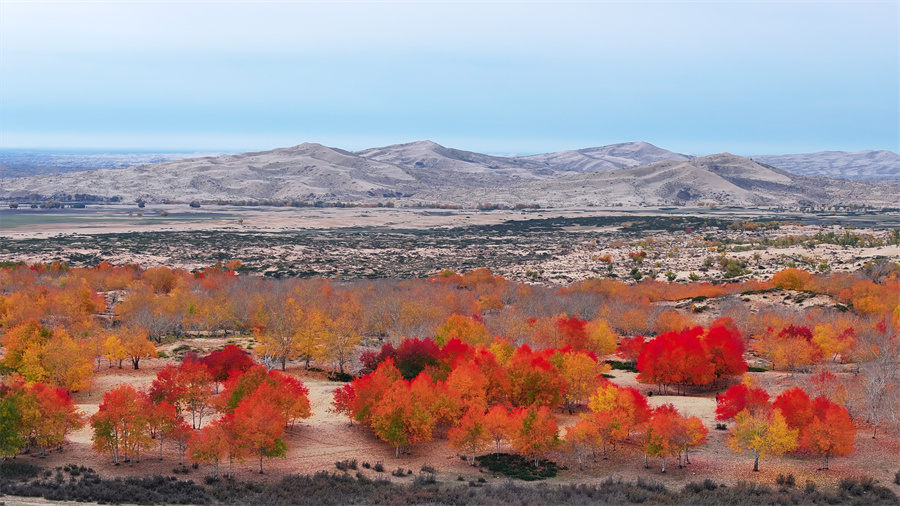 额德克红叶林里的树是生长在沙漠上的欧洲山杨,占地2600亩,每到秋季满树皆是红叶。在阳光的映衬下,大片的红叶如霞似火,红透整个沙漠。远处的蓝天、白云,近处的沙丘、欧洲山杨,红橙黄绿层林尽染,绘成一幅浓墨重彩的油画,让人眼前一亮。
